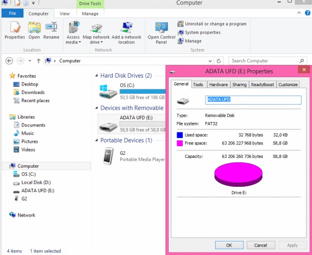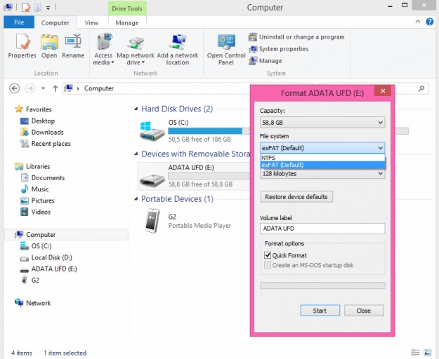 Но на тот случай, если подобные «мероприятия» планируются, изначально накопитель необходимо переформатировать в NTFS либо exFAT. Стандартными средствами операционной системы Windows 8 это сделать очень легко.