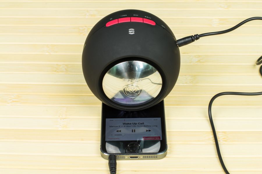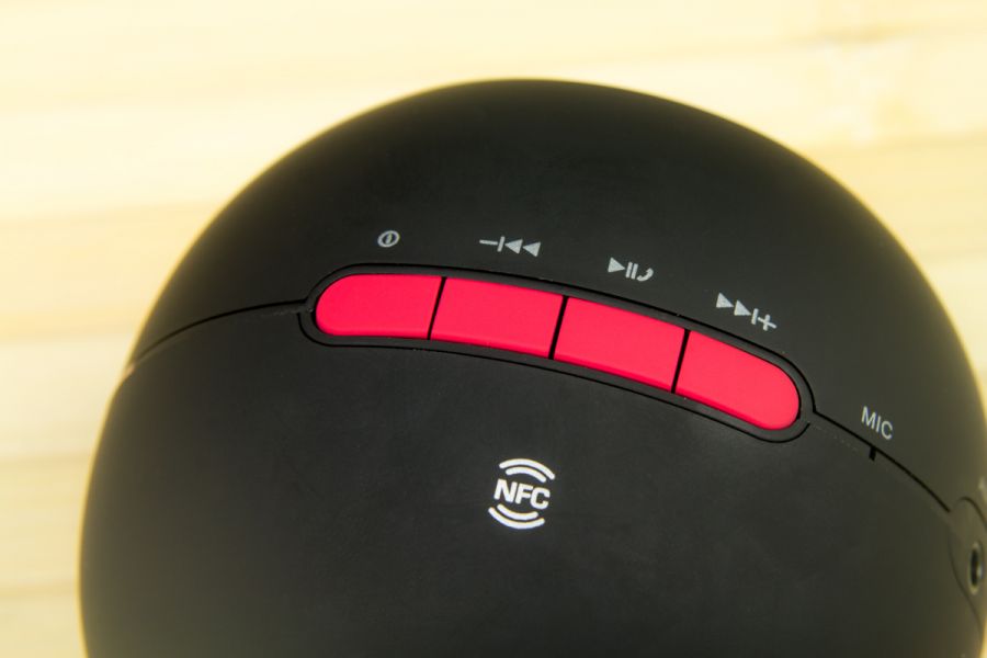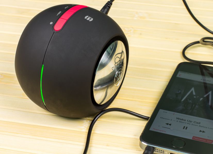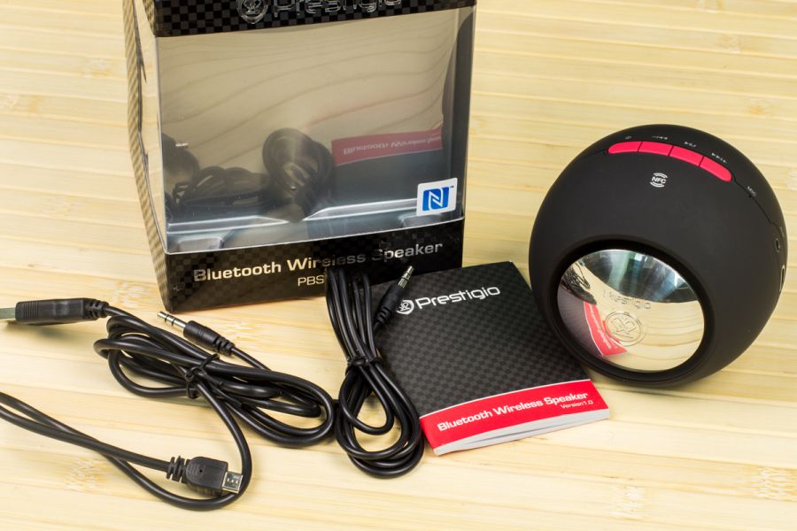 Обзор портативной Bluetooth-колонки Prestigio PBSP1 с NFC – «музыкальный шар»Беспроводная колонка со встроенным Bluetooth-модулем, микрофоном для общения по громкой связи, NFC и стандартным 3,5 мм аудиовыходом. Насколько интересным получилось устройство, кто его потенциальная аудитория, как «звучит» и сколько работает на одном заряде батареи!? Обо всем этом и пойдет речь. Комплект поставки Штатной комплектацией Prestigio PBSP1 предусмотрено, конечно же, само устройство, краткое руководство пользователя, зарядный кабель micro-USB/USB и 3,5 мм аудиокабель. Дизайн Во внешности PBSP1 легко проследить фирменные черты Prestigio — черный пластик с soft-touch покрытием в основе, тот же материал, но уже без софт-тач и глянцевый «под металл» предназначен для двух боковых вставок с логотипом компании-производителя. А вот в красном цвете выполнены функциональные кнопки. Конструкция получилась симпатичной! Как по мне, Prestigio PBSP1 удачно «впишется» как в любой домашний интерьер, так и рабочую атмосферу офиса. Весьма кстати колонка была и на пикнике — отдых на природе с музыкальным сопровождением всегда веселее, чем без такового. Подключение и элементы управления Prestigio PBSP1 можно подключить к любому смартфону, планшету или ПК, поддерживающему Bluetooth и NFC. Стабильность сигнала нареканий не вызывает — протестировано наiPhone 5, HTC One mini 2, а также Acer Aspire s3 и др. Дальность работы Bluetooth-передатчика стандартная — разрывы связи не проявляются в пределах 8-10 метров или одной-двух стен квартиры. Все разъёмы и элементы управления находятся сверху. Есть четыре кнопки — включения/выключения, воспроизведения/паузы/принятия вызова и еще две, регулирующие громкость сигнала и перелистывание треков. Также сверху обозначена зона NFC, находится встроенный микрофон, разъем питания USB DC 5V, индикатор заряда батареи и вход AUX для устройств, которые не могут подключиться к колонке по Bluetooth и NFC. Аккумулятор Естественно, Prestigio PBSP1 не питается от воздуха — встроенная батарея емкостью 400 мАч обеспечивает в среднем 3-4 часа (в зависимости от громкости) ее автономной работы в режиме непрерывного проигрывания музыки. Несколько сократить потребление заряда позволить использование вместо Bluetooth- и NFC-соединения аудиокабеля. Заряжается колонка через разъем mini-USB. О полном заряде батареи сигнализирует светодиод на ее корпусе – загорается зеленым. Краткие спецификации
