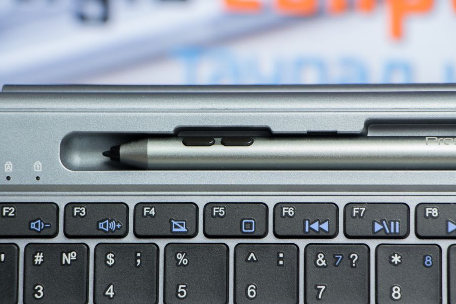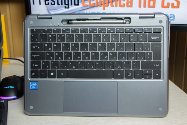Обзор Prestigio Ecliptica 116 C3: клавиатура и тачпадPrestigio Ecliptica 116 C3 – это не совсем обычный ноутбук, потому что им можно управлять с тачпада, мышкой и непосредственно с экрана, потому что он сенсорный. Удобно? Да! А еще и очень практично, потому что трансформирующийся корпус позволяет выставить нужный угол и подстроить ноутбук под ситуацию. О сенсорном экране и стилусе будем говорить отдельно. Сейчас же остановимся на тачпаде и клавиатуре. ТачпадРазмер 11 х 6,5 см. 40% нижней панели занимают пополам правая и левая кнопка, аналогичные тем, что в мышках. Кнопки визуально не выделены ничем. Площадка продавливается с очень небольшим усилием и тем самым вызывает щелчок. Тачпад можно назвать большим, если соотнести его к общим габаритам ноутбука. Материал покрытия и его цвет почти не отличаются от тех что в корпусе. Он матовый и тактильно приятный. Помимо обычного курсора с одним прикосновением, тачпад отзывается на двойные и тройные жесты – с его помощью можно скролить текст или зуммировать картинки. КлавиатураНа клавиатуре ноутбука Prestigio Ecliptica 116 C3 всего 79 клавиш. Это меньше обычного, но включает в себя: