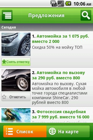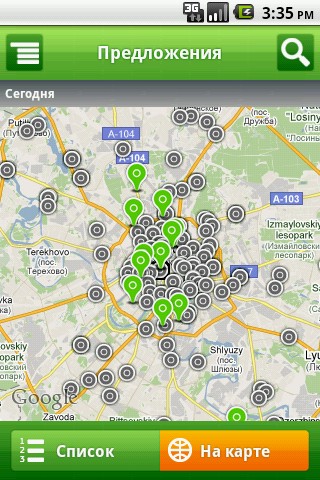 Сразу после открытия приложения вы оказываетесь на главном экране, где собраны все актуальные приложения в виде списка, если вам удобнее ориентироваться по карте, чтобы, например, найти абонемент в спортзал поближе к дому, то можно переключиться в альтернативный режим. Вот так выглядят оба режима: