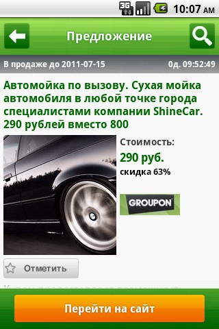 Когда найдёте то, что вас заинтересует, можно тапнуть на предложение и увидеть подробности. В карточке акции находится небольшое описание, сумма, которую придётся выложить за купон, размер скидки, адрес сайта, время действия акции. Из приложения можно перейти на сайт, предоставляющий скидку, чтобы купить купон.