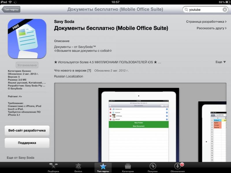 Обзор приложения Mobile Office Suite для iPadНеплохая альтернатива платным офисным приложениям под iPad. Удобный интерфейс, возможность создавать документ в редакторе, по смыслу напоминающем WORD и таблицу в аналоге Excel, сортировка документов по папкам и многое другое. Все это Mobile Office Suite. Сразу же о приятном! Буквально второго августа Mobile Office Suite получил обновление. Среди прочих новшеств появилась полноценная поддержка русского языка в интерфейсе. Размер дистрибутива в App Store занимает чуть меньше четырех мегабайт. При наличии активного подключения к Сети, и пройденной авторизации в магазине – загрузка с автоматической установкой не занимает и половину минуты. Лично у меня было именно так. Сразу же на что обращаешь внимание в этом меню – достаточно большая зеленого цвета панель, на которой два функциональных подменю – «Новая папка» и «Новый документ». Уверен, за что в системе отвечает каждое из них, можно и не говорить – все понятно уже из самых названий. Выше этой панели располагаются папки, а также документы, которые система сохраняет во время редактирования автоматически. Разумеется, и с папками, и с сохраненными таким образом документами пользователь может проделывать различные манипуляции. Их можно сохранять, загружать в Google, печатать и пр. Что же относительно папок, пользователь может сохранять их переименовывать и перемещать. Все, как по мне логично. Кроме того, и папки, и автоматически сохраненные документы, можно удалять, прямо из корневой. Реализовано удобно – пару нажатий, не более того. В самом же низу главного меню расположена панель upgrade, благодаря которой пользователь может в считанные секунды получить обновление для своего Mobile Office Suite, пройдя, правда, предварительную авторизацию в App Store. Кликнув на «Новый документ», пользователь перейдет в другое подменю, в котором ему на выбор будет предложение три редактора создания документов, таблиц, либо же рисунка. Для последнего уготовано приложение Paint. В текстовом редакторе ничего особенного вы не встретите – достаточно простое приложение, в котором можно создавать текстовую заметку, но не более того. Какого-либо форматирования текста нет, хотя и не исключено, что они появятся с новыми обновлениями пакета. Здесь пользователь получает возможность набора текста посредством виртуальной клавиатуры, либо же аппаратной (если она у него есть), которую легко подключить к iPad. Проверка правописания присутствует, однако я бы рекомендовал не слишком этому доверять – проверка правописания в iOS частенько ошибается. Созданный документ пользователь может «сохранить», «сохранить как» (то есть, загрузить в Google, отправить как приложение и пр.), ну или как третий вариант – «отклонить». А вот в редакторе таблиц несколько функциональных кистей нашлось – это еще один плюс. Детально на этом останавливаться не буду – функциональное предназначение каждой из них понятно уже, хотя из соответствующего ярлыка. Варианты с сохранением созданного документа аналогичны тем, что в предыдущем редакторе. Откровенно, не совсем понял, почему в пакете офисных приложений имеется еще и приложение Paint, однако раз уж приложение по природе бесплатное, то почему бы в конце-концов, и нет. Кистей здесь нет - возможно, только рисование. Но вместе с тем, это ведь бесплатное приложение. А если «даром» - то это самая лучшая цена, ко