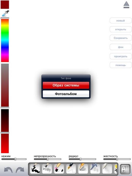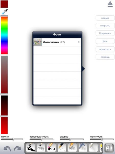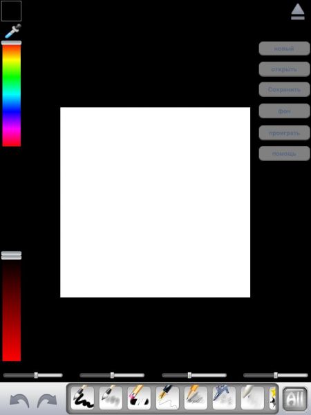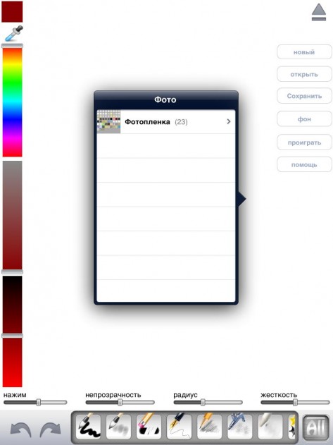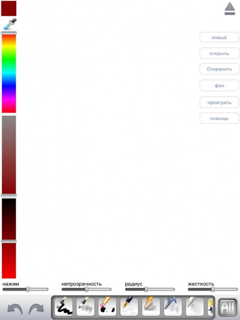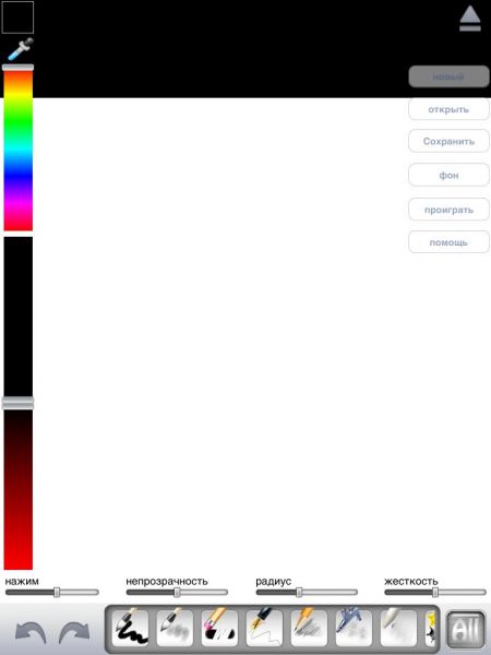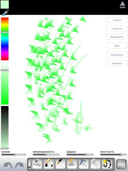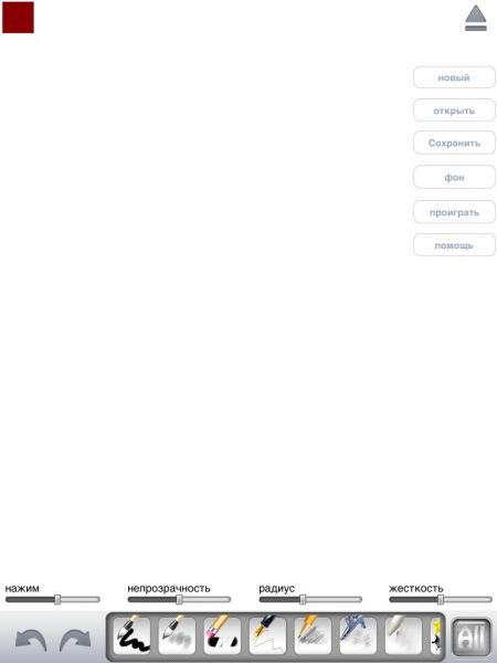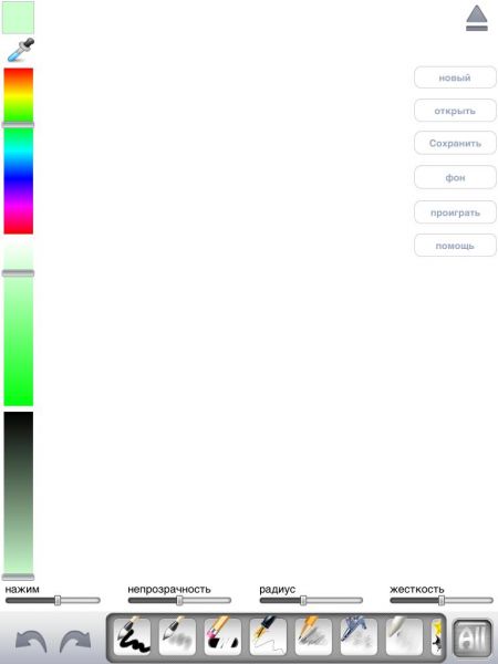 Активировав приложение, пользователь окажется в главном меню программы, которое состоит из четырех разделов: «Рисовать», «Галерея», «Помощь», и собственно «О программе»! Два последние как по мне, никакого интереса собой не представляют – они так или иначе технические. Конечно, быть может кому-то из наших читателей в процессе знакомства с приложением, будет полезен подраздел «Помощь», однако лично я предпочел изучать его без «руководства» и в конечном итоге не прогадал – освоился не более чем за час. Интересно, что страницу эту он может масштабировать в процентном соотношении, а специальная пиктограмма подскажет ему величину холста в конкретно взятый момент. Максимально масштаб 100% не ограничивается – можно «растягивать» бесконечно, но при этом, конечно же, не стоит забывать и о таком факторе, как удобство работы. В самом верху страницы, справа и слева от центра расположены две кнопки. Справа кнопка обустроена в виде небольшого подчеркнутого треугольника, а слева это небольшой квадратик. Обе эти кнопки «прячут» или возвращают обратно вертикально ориентированные функциональные панели. Что же относительно «Проиграть», нажав на эту клавишу, пользователь попадает в специальное подменю, в котором система демонстрирует, как создавался последний рисунок пользователя. Предназначение последнего, как по мне, вещь также полезная – позволяет показать коллеге/другу (нужное подчеркнуть), как создавался рисунок. Слева пользователь может выбирать тот или иной цвет для рисования. Снизу нашего диалогового окна расположены шкалы, отвечающие за «нажим», «непрозрачность», а также «радиус», и «жесткость». Уверен, о чем здесь речь, понятно без объяснений. Правее этого подменю обустроена небольшая, горизонтально ориентированная панель, на которой расположены различные кисти, применяемые пользователем в процессе создания рисунка. Кнопка ALL, которая последняя в этом подменю, переводит пользователя в достаточно обширное подменю, где тот может выбрать необходимые ему кисти для рисования. Их можно выбрать как всего одну, так и несколько штук кряду. Достаточно лишь нажать на понравившиеся и отметить их затем кнопкой «Добавить в Избранное». Джерело: SmartPhone.ua Обговорення новиниИван 93: как по мне так это бесполезная программа! а так, то очень хорошо продумано, большая функциональность. интерфейс интересный) прикольно попробовать пару раз, а так.... ну просто игрушка... Попередні новини