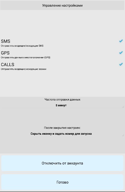 После загрузки программа просит создать аккаунт или подключиться к уже готовому на сайте производителя ПО. Процедура эта несложная и занимает совсем мало времени. Затем в аккаунте, который надежно защищен аппаратным шифрованием AES-128, нужно выбрать из предложенного списка те данные, которые вы хотели бы отслеживать: входящие/исходящие SMS-сообщения, данные о месторасположении гаджета (GPS), а также входящие/исходящие звонки. Причем отображаться будет как номер звонящего, так и время поступления звонка. В распоряжении пользователя также возможность задать частоту отправки данных.