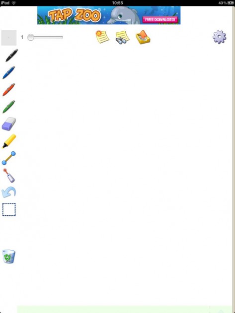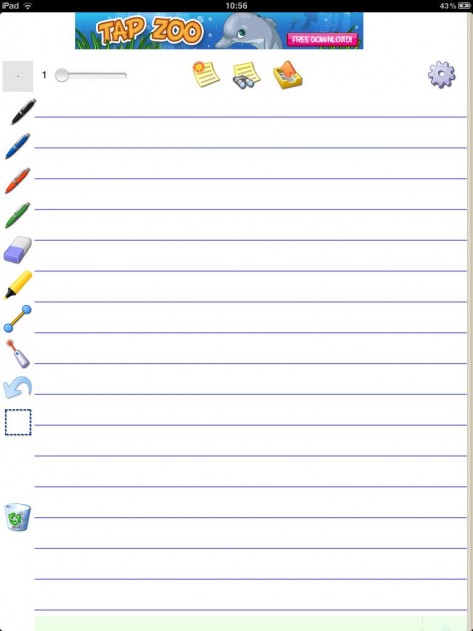 Стилистически приложение устроено следующим образом. Имеется некая виртуальная вертикально ориентированная страница формата А4, слева от которой расположены основные функциональные кисти – ручки нескольких цветов, маркер, резинка, при помощи которой пользователь может стереть написанное или нарисованное и др. Несколько элементов имеется и сверху, над страницей. Здесь же далее идут ярлыки перехода в меню созданных документов, активации поля для создания нового документа, а также ярлык подменю, который активирует возможность копировать созданный документ, либо же отправить его по e-mail, ну или как вариант - в фотоархив. Последний из этих ярлыков, получивший название Background, позволяет на изначально чистую страницу нанести сетку либо же «расчертить» ее в линию – зависит от необходимости. В любом случае, на выполнение какого-либо из этих действий необходима всего пара касаний. Вернемся к кистям слева. В самом верху одна над другой расположены четыре виртуальные ручки разных цветов. Что бы выбрать, какой ручкой писать/рисовать, достаточно лишь кликнуть на нее пальцем.