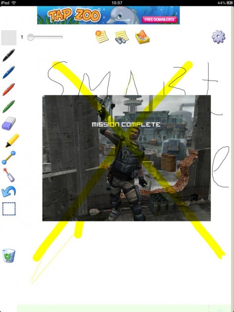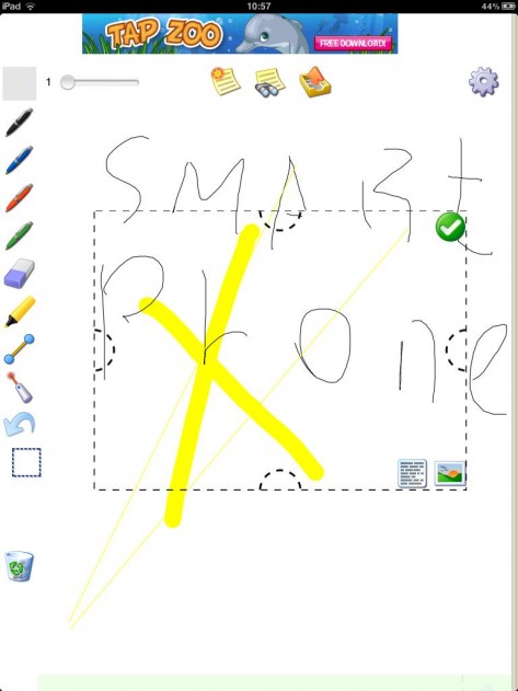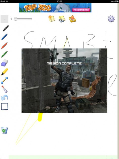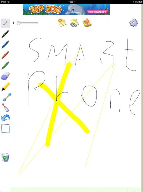 Следующая, кисть, которая расположена сразу же за маркером, поможет создать строгую прямую линию. А вот для каких целей следующая кисть, откровенно говоря, я так и не понял. Выбрав ее, затем, поставив палец на наш виртуальный листик, и немного «поводив» по панели, в конечном итоге ровным счетом ничего не происходит. Ярлык, изображенный в формате некой полуовальной стрелки, позволяет отменить последнее действие. И, наконец, для чего же необходим ярлык в виде квадратика!? Актировав его на странице, появляется некоего размера квадратик, выполненный в пунктире. По виду напоминает этакое футбольное поле с воротами на торцах. В сущности, при помощи этих «ворот» пользователь может масштабировать территорию, охваченную «квадратом». Внизу этого квадратика расположены два ярлыка – один в формате миниатюрной картинки, а другой в формате строчек текста. Активировав второй из них, пользователь получает доступ к виртуальной клавиатуре своего iPad и возможности написать заметку. А вот ярлык в формате небольшой фотографии предусматривает возможность работать с имеющимися в памяти аппарата фотографиями. Нажав на этот ярлык, мы видим, что на экране появляется подраздел «Фото», откуда, собственно говоря, можно выбрать фото. Дальше его можно подписывать, подтирать, раскрашивать и выполнять ряд других, приятных себе «безобразий»!