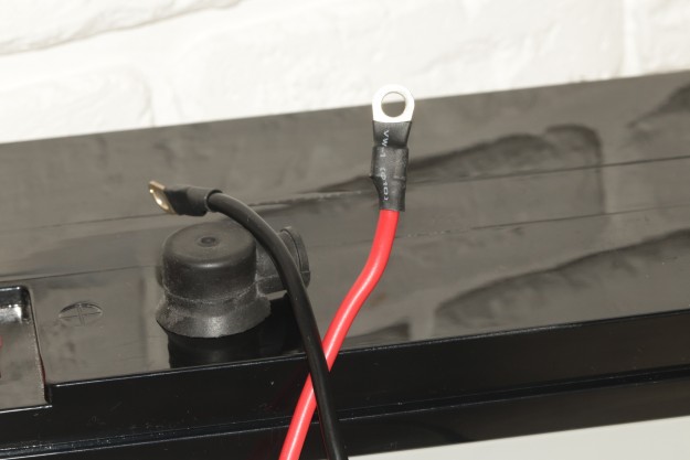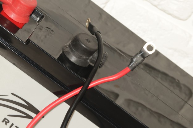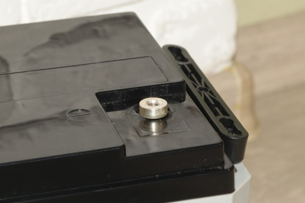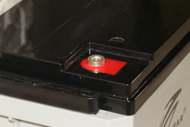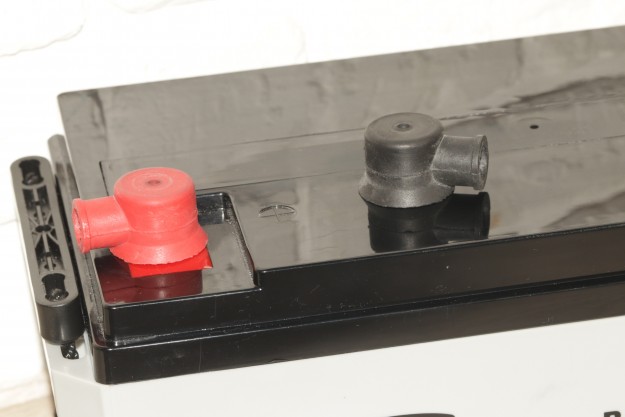 Помимо пластика, на внешней части корпуса немного металла, а кроме того, есть винтообразный трос. Последний вместе с пластиковыми ручками предназначен для переноски аккумулятора. Касательно металла сверху – это «посадочные места» под провода с контактными площадками. Оба они желтоватого оттенка. Говорить, что это золотистое напыление я не берусь, но и утверждать обратное на корне также не стану. Формат крепления контактных кабелей легко понять, уже взглянув на характер комплекта поставки и внутренние резьбы на отмеченных выше площадках.