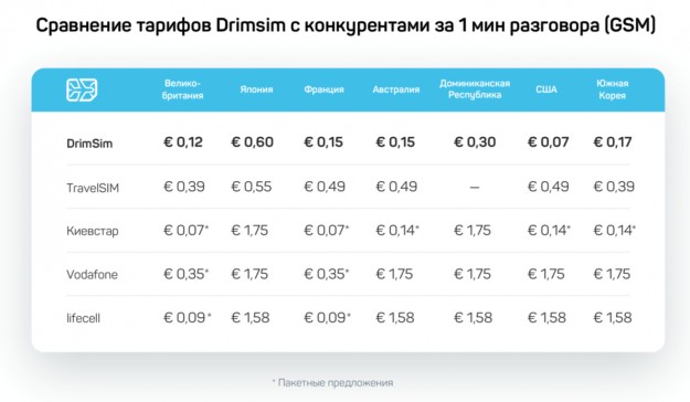Тарифная политика sim-карты для международных звонков Drimsim зависит только от страны пребывания. В отличии же от местных sim-карт, которыми в основном пользуются продвинутые туристы со стажем, карту Drimsim не нужно выбрасывать сразу же после возвращения домой. Она обязательно пригодится в следующем путешествии. Стоимость же самой sim-карты Drimsim – 10 €.
