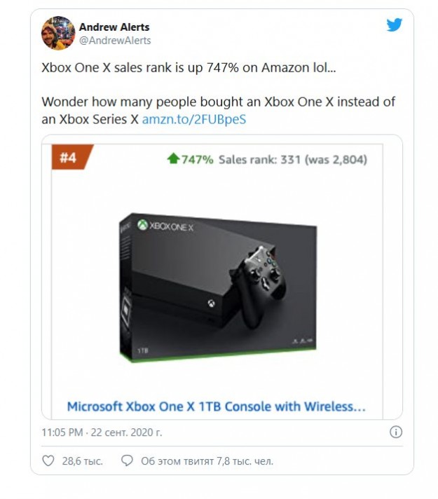 Ох уж этот нейминг: рейтинг Xbox One X зашкаливает из-за Series XMicrosoft вчера начала принимать заказы на некст-ген консоли Xbox Series X и Series S. Принимать заявки взялись многие ритейлеры по всему миру, в том числе один из ведущих международных сетей Amazon. Но вот казус. Как оказалось, многие потенциальные покупатели попадают на страницу не Series X, а One X - самой мощной консоли текущего поколения. Журналисты и блогеры обратили внимание, что рейтинг последней вырос сразу на 747%, что определённо связано с дебютом Series X. В рейтинге продаж консоль поднялась на 2000 позиций, что еще более показательно в данном контексте.