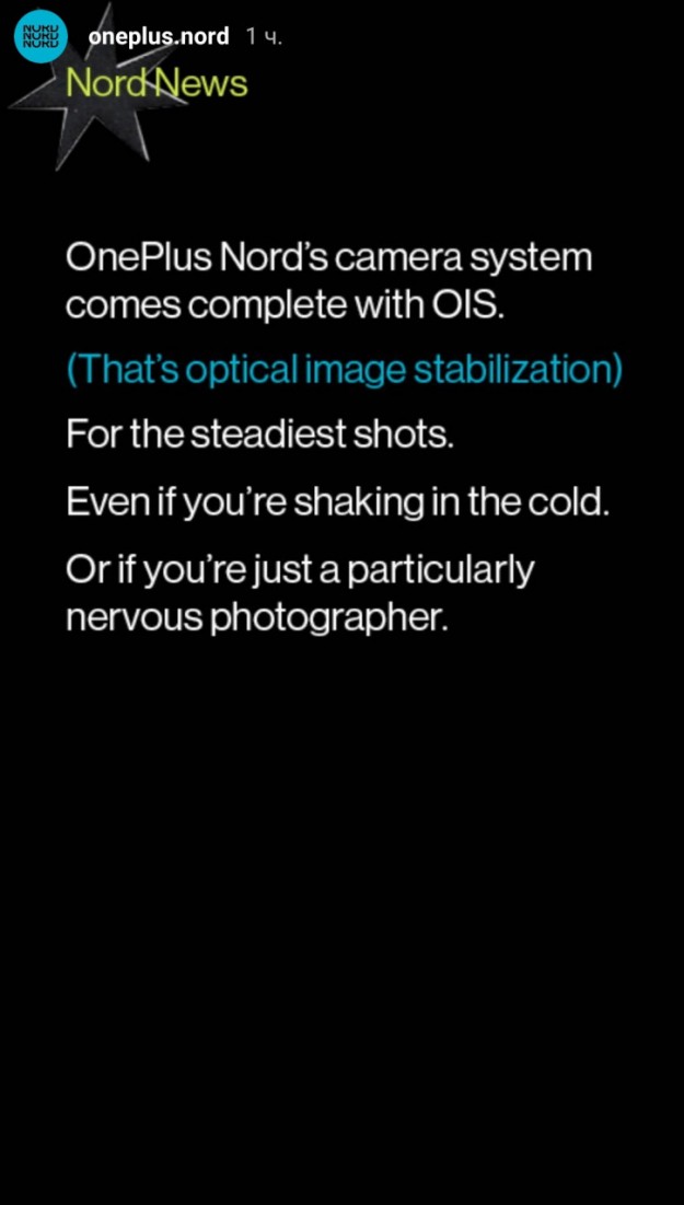 OnePlus пообещала оптостаб в камере OnePlus NordOnePlus открыла в социальных сетях рублику Новости Nord, в рамках которой рассказала об одной из важных особенностей камеры грядущего OnePlus Nord. Согласно официальной информации, аппарат получит оптическую стабилизацию изображения, что позволит делать четкие снимки даже тогда, когдав вас трясет от холода или же если вы просто очень нервный фотограф". Состав камеры пока не подтвержден. По разным данным, OnePlus Nord получит тройную или четверную камеру с 48-Мп основным сенсором.