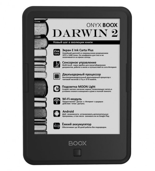 Модель ONYX BOOX Darwin 2 оснащена 6-дюймовым емкостным сенсорным дисплеем E Ink Carta Plus с контрастностью 14:1, разрешением 1072 x 1448 точек, плотностью пикселей 300 dpi и функцией плавно регулируемой подсветки MOON Light, позволяющей комфортно читать в условиях различной освещенности. Помимо сенсорного экрана устройством удобно управлять кнопками листания, расположенными по бокам экрана, а также клавишей под экраном, возвращающей на шаг назад. В модели установлен 2-ядерный процессор с тактовой частотой 1 ГГц, в ней также имеется 512 МБ оперативной и 8 ГБ flash-памяти с возможностью использования карт памяти объемом до 32 Гб, а аккумулятор емкостью 1700 мАч позволяет до месяца использовать устройство без подзарядки.