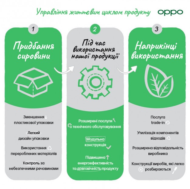 - OPPO также создала систему переработки продуктов. Для продвижения ресайклинга и повторного использования подержанных мобильных телефонов компания предлагает услуги по обмену на внутреннем и международном рынках. В Китае на сегодняшний день по этой схеме переработано более 1,2 миллионов телефонов, что составляет более 216 тонн электронных отходов. В ЕС и других регионах OPPO оказывает финансовую поддержку местным системам по переработке, участвует в программе Green Dot (программа по переработке отходов упаковки) и сотрудничает с профессиональными сторонними ресайклинговыми компаниями.