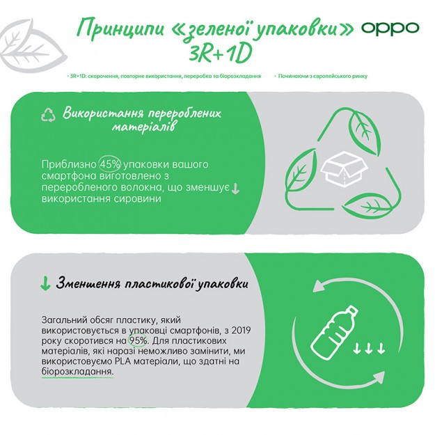 - OPPO стремится внедрять всемирно признанные принципы экологической упаковки «3R+1D» и соблюдает снижение веса упаковки, повторное использование переработанных материалов, использование материалов, подлежащих переработке и биоразложению в своей упаковке. Начиная с европейского рынка, общий объем используемого в упаковке смартфонов пластика с 2019 года сократился на 95%. Для пластиковых материалов, которые в настоящее время невозможно заменить, OPPO использует PLA биологически разлагаемые материалы. Кроме того, примерно 45% упаковки смартфонов на европейских рынках было изготовлено из переработанного волокна, что уменьшило количество использованного сырья.