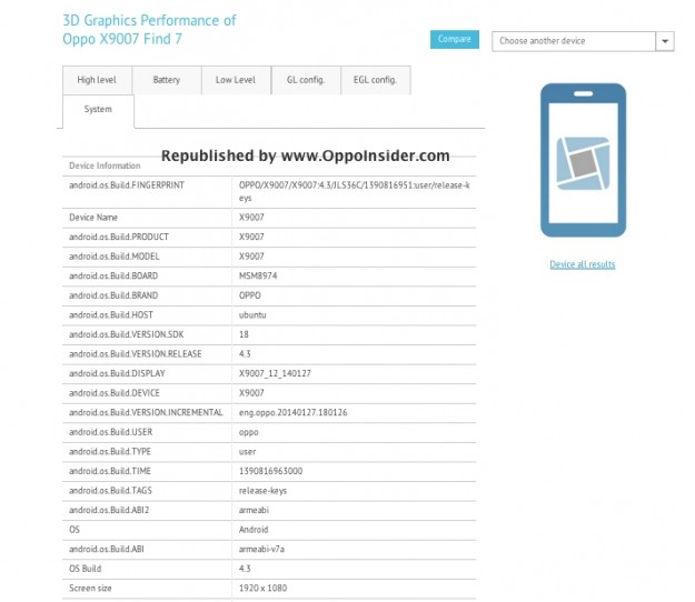 Oppo Find 7 с Full HD дисплеем замечен в GFX BenchВ популярном бенчмарке GFX Bench был замечен не представленный еще официально флагман Oppo Find 7 с дисплеем, разрешение которого составляет 1920x1080 точек, а не 2560x1440 пикселей, как сообщал ранее официальный тизер производителя.