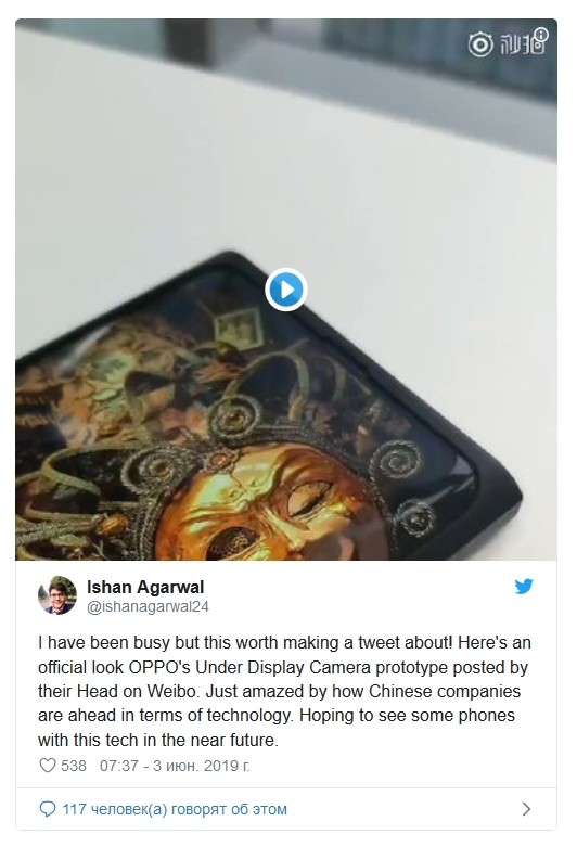 OPPO показала прототип смартфона с невидимой камерой под экраномКитайская OPPO может стать одним из лидеров инноваций и сделать еще один решительный шаг в сторону полной безрамочности. Руководитель компании опубликовал видеоролик с демонстрацией прототипа смартфона с невидимой фронтальной камерой, интегрированной в экран. В нормальном режиме использования всю лицевую панель занимает дисплей, но при активации селфи-камеры область в верхней части экрана затемняется, обнажая камеру. Как это выглядит, смотрите сами: