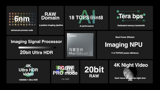 Нейронный процессор MariSilicon X обеспечивает обработку 18 триллионов операций в секунду (TOPS). Для сравнения, нейронный модуль платформы Apple A15 Bionic, на которой основаны iPhone 13, способен обеспечить 15,8 TOPS. Так что, новинка Oppo явно обеспечит весьма высокий уровень производительности при работе с алгоритмами искусственного интеллекта. При этом MariSilicon X демонстрирует высокую энергоэффективность в 11,6 TOPS/Вт.