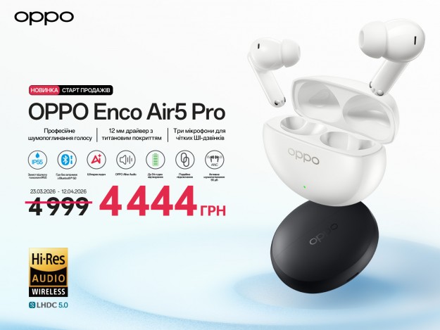 OPPO представляє Enco Air5 Pro: вдосконалене шумозаглушення, потужні баси та до 54 годин роботиКомпанія OPPO AED Україна представила OPPO Enco Air5 Pro — свої найновіші бездротові навушники з активним шумозаглушенням, створені для сучасних слухачів, що постійно перебувають у русі. Завдяки системі вдосконаленого шумозаглушення з глибиною поглинання звуку до 55 дБ у надширокому частотному діапазоні 5 000 Гц, OPPO Enco Air5 Pro забезпечують спокій флагманського рівня за доступною ціною. На додачу, 12-міліметровий драйвер із титановим покриттям створює потужний звук, що нагадує атмосферу концерту, з насиченими та енергійними басами. Водночас вражаючий час автономної роботи — до 54 годин загального відтворення — дозволяє насолоджуватися музикою без сторонніх шумів ще довше. Шумозаглушення професійного рівня: ваш острівець спокою у реальному світіРозроблені спеціально для блокування звуку людських голосів, OPPO Enco Air5 Pro миттєво створюють атмосферу тиші у переповнених та шумних місцях. Використовуючи систему ANC з подвійним зворотним зв’язком на базі трьох мікрофонів у кожному навушнику, флагманське шумозаглушення в OPPO Enco Air5 Pro забезпечує активне поглинання шуму на рівні 55 дБ у надширокому діапазоні 5 000 Гц. Ефективність системи підтверджена сертифікатом T?V Rheinland за високі показники шумозаглушення, що дозволяє краще зосередитися будь-де: від студентських гуртожитків до метро чи офісів. Для ще більшої ефективності функція динамічного ANC у реальному часі (Real-time Dynamic ANC) автоматично підлаштовує рівень шумозаглушення залежно від оточення та посадки навушників, створюючи стабільний баланс між тишею та комфортом. Завдяки точним обчисленням кожен звук зіставляється з оптимальною кривою шумозаглушення, що усуває такі проблеми, як надмірний тиск на вуха або низька ефективність через розбіжність між алгоритмами та реальним шумом. Завдяки системі AI Clear Call із трьома мікрофонами в кожному навушнику, дзвінки залишаються кришталево чистими навіть у галасливому середовищі. Використовуючи архітектуру з трьома мікрофонами, два зовнішні мікрофони ідентифікують і фіксують мовлення, пригнічуючи фонові шуми, тоді як внутрішній мікрофон захоплює чистий голосовий сигнал безпосередньо з вушного каналу. Це дозволяє ефективно мінімізувати шум вітру та інші гучні звуки, забезпечуючи природну якість зв'язку навіть при швидкості вітру до 25 км/год. Потужні баси та концертне звучання.Навушники OPPO Enco Air5 Pro створені для відтворення концертного звуку, де б ви не були. Це досягається завдяки поєднанню збільшеного драйвера та ретельного налаштування для чіткої деталізації та потужного басу. 12-міліметровий драйвер із титановим покриттям та конструкцією з великою амплітудою збільшує максимальний хід діафрагми на 100% порівняно з попереднім поколінням. Це гарантує енергійний, пружний бас, насичені середні частоти та кришталево чисті високі ноти. Працюєте ви під час довгих офісних сесій чи відпочиваєте у тривалому перельоті — живе та імерсивне звучання змусить поп, рок, класику та електроніку ожити, ніби ви стоїте в центрі сцени на концерті.