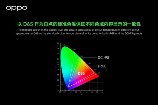 Для полнопрофильной системы управления цветом используется алгоритм высшей спецификации и оборудование для записи цвета во время съемки. R&D-исследования ОРРО способствовали достижениям в таких сферах, как коррекция деформаций, многокадровое уменьшение шума и чрезвычайное перцептивное разрешение. Теперь же новая система от OPPO поддерживает датчики изображения с режимом DOL-HDR. Технология DOL-HDR синтезирует различные условия экспозиции изображения — работает, используя два последовательных изображения (одно с более темным значением экспозиции и одно с более светлым) и объединяя их, чтобы создать единый кадр. Поэтому даже при ярком свете удается сделать замечательные, качественные снимки. Теперь, когда существует совершенное аппаратное обеспечение, возникает вопрос калибровки. Процедура калибровки экрана OPPO гарантирует профессиональную цифровую точность передачи цветов на уровне пленки примерно 0,4 JNCD, обеспечивая тем самым неизменно точное отображение на экране. С другой стороны, собственный алгоритм OPPO гарантирует совместимость цветовой гаммы, регулируя DCI-P3 с белой точкой D65 в центре цветового пространства.