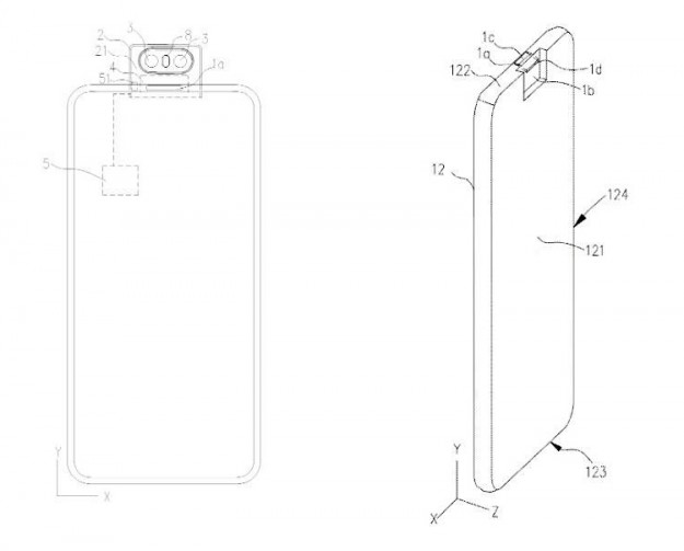 Как можно видеть на изображениях, смартфон получит откидной модуль в верхней части корпуса: его конструкция предусматривает наличие двух оптических элементов, разделённых вспышкой. Модуль сможет откидываться на 180 градусов, избавляя от необходимости использования отдельной лицевой камеры.
