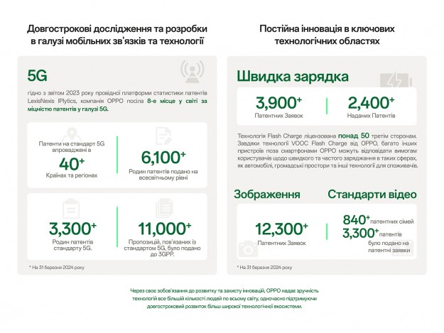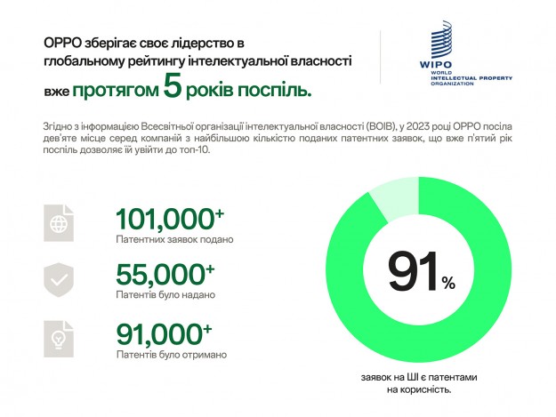OPPO п'ятий рік поспіль входить до десятки лідерів світового рейтингу Інтелектуальної Власності (ІВ)Провідна світова технологічна компанія OPPO сьогодні, у Всесвітній день інтелектуальної власності (ІВ), випустила White Paper про інновації та інтелектуальну власність OPPO, підтверджуючи свою непохитну прихильність до інновацій та захисту інтелектуальної власності. За даними Всесвітньої організації інтелектуальної власності (ВОІВ), у 2023 році OPPO посіла дев'яте місце у світі за кількістю патентів, поданих відповідно до Договору про патентну кооперацію (РСТ), і вже п'ятий рік поспіль входить до світової десятки лідерів. Станом на 31 березня 2024 року OPPO подала понад 101 000 патентних заявок по всьому світу, отримавши понад 55 000 патентів, з яких 91% - це патенти на корисні моделі.