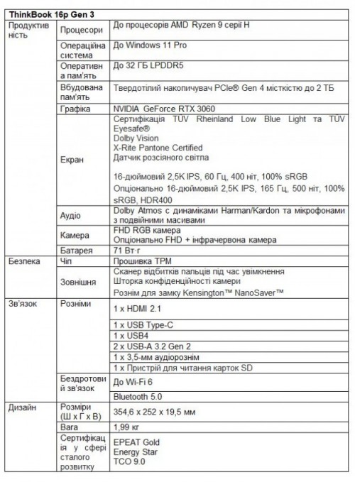 Оптимальне рішення для малого та середнього бізнесу – новий Lenovo ThinkBook 16p Gen 3Новий Lenovo ThinkBook 16p Gen 3 допоможе творцям контенту та досвідченим користувачам повністю розкрити свій творчий потенціал. Новий високопродуктивний ThinkBook оснащений процесором AMD Ryzen™ 9 6000 серії H та дискретною графікою NVIDIA GeForce® RTX™ 3060 для забезпечення вражаючої продуктивності з Windows 11. Імерсивні 16-дюймові IPS-дисплеї з вузькими рамками та роздільною здатністю 2,5K мають сертифікати T?V Rheinland Low Blue Light та T?V Eyesafe® для максимального комфорту для зору та оснащені датчиком Ambient Light Sensor, який регулює яскравість підсвічування екрана та клавіатур. Доступні два варіанти дисплеїв, включаючи панель з яскравістю 400 ніт 60 Гц та новітню панель HDR400 з яскравістю 500 ніт 165 Гц, сертифіковану VESA, яка дозволяє насолодитися яскравими кольорами з підвищеною деталізацією тіней та відблисків. Обидва варіанти дисплея також сертифіковані X-Rite Pantone® та підтримують контент Dolby Vision®.