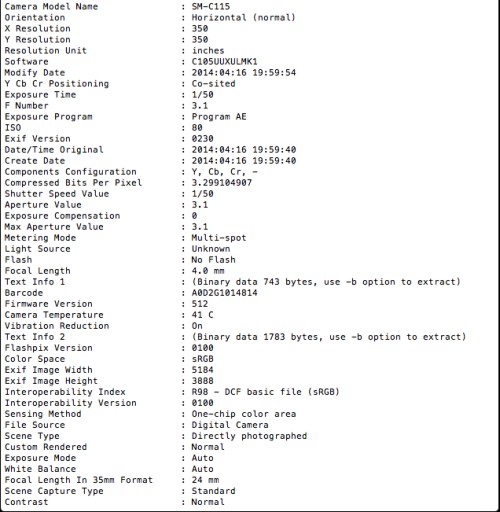 Данные EXIF-файла сообщают о снимке разрешением 20Мп (5184х3888 точек) с соотношением сторон 4:3, сделанным без использования вспышки. Фокусное расстояние 4мм, ISO 80, апертура f/3.1, а выдержка 1/50 сек.