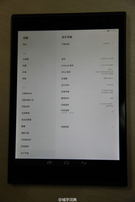 Итак, если верить снимкам, Mi Pad 2 получит от производителя 7.9-дюймовый дисплей с разрешением 2048х1536 пикселей, 4-ядерный процессор Intel Atom с тактовой частотой до 1.8 ГГц и графикой Intel HD Graphics, 2 ГБ оперативной памяти и 16 ГБ встроенной. Работать планшет будет под управлением операционной системы Android 4.4.4 KitKat с фирменной оболочкой MIUI 6.