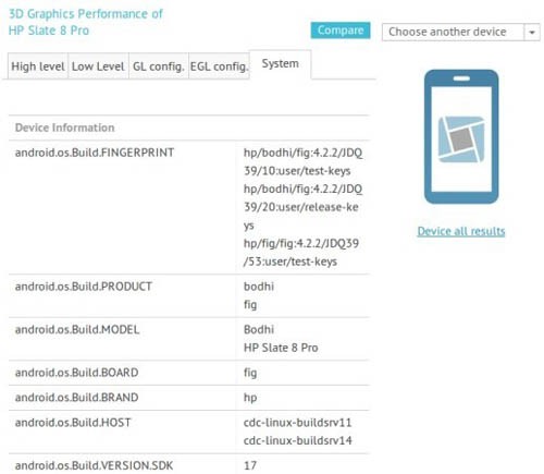 Опубликованы спецификации планшета HP Slate 8 ProВ сети появилась информация о готовящемся планшете HP Slate 8 Pro. На днях новинка засветилась в тестере GFXBench, благодаря чему стали известны следующие спецификации.