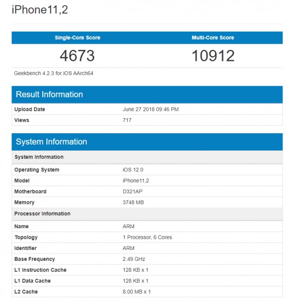 Смартфон с маркировкой iPhone11,2 базируется на шестиядерном ARM-процессоре с тактовой частотой 2,49 ГГц и по 128 КБ кэша L1 и L2. Предположительно, это новый процессор Apple A12. Объём оперативной памяти достигает 4 ГБ. Операционная система — iOS 12.