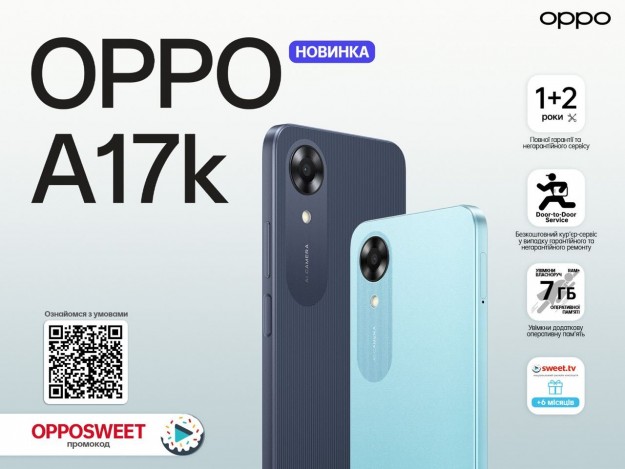Надпродуктивність із технологією розширення оперативної пам’яті Завдяки мобільній платформі MediaTek Helio G35 OPPO A17k забезпечує ефективну продуктивність із тактовою частотою процесора до 2,3 ГГц. Об’єм оперативної пам’яті телефону можна легко збільшити до 7 ГБ, використовуючи технологію OPPO RAM Expansion та таким чином запозичивши до 4 ГБ невикористаної ПЗУ. Це дозволить пристрою запускати кілька програм, які потребують великої кількості пам’яті, з меншою затримкою. Захоплюючий звук OPPO A17k пропонує кращий звук і більшу гучність. З оновленою аудіосистемою Dirac 3.0 ви завжди можете насолоджуватися повним спектром кристально чистого звуку. Окрім цього, OPPO A17k також пропонує режим ультрагучності, з яким вам не завжди будуть потрібні колонки. Зручність та ефективність із ColorOS 12.1 OPPO A17k створений для зручності та ефективності завдяки OPPO ColorOS 12.1. Перекладач трьома пальцями з Google Lens може швидко перекладати текст на знімку екрана понад 100 підтримуваними мовами. FlexDrop дозволяє користувачам тримати додаткову програму відкритою в маленькому спливаючому вікні, забезпечуючи ефективнішу багатозадачність під час перемикання між програмами. ColorOS 12.1 також містить інші функції безпеки, такі як п’ятиступеневе керування доступом і захист фотоінформації, щоб допомогти захистити конфіденційну інформацію. Додаткові сервіси Компанія ОРРО AED Україна турбується про своїх користувачів та їх користувацький досвід, а отже надає додаткові бонуси у вигляді сервісів та першокласного обслуговування. При купівлі смартфонів ОРРО в авторизованих точках продажу по 31.03. 2023 року, ви отримуєте один рік гарантійного сервісу та два роки безкоштовного обслуговування негарантійних випадків, а саме: