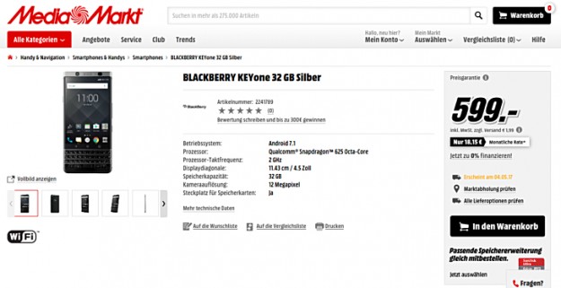 Открыт предзаказа на смартфон BlackBerry Keyone в ЕвропеНемецкий онлайн-ритейлер Media Markt начал принимать предварительные заказы на анонсированный в рамках выставки MWC 2017 qwerty-смартфон BlackBerry Keyone.