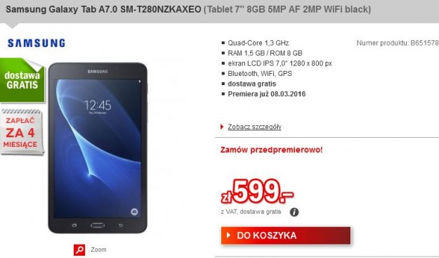 Открыты предзаказы на еще неанонсированный Samsung Galaxy Tab A (SM-T280)Не представленный еще официально 7-дюймовый планшет Samsung Galaxy Tab A (SM-T280) уже стал доступен для предзаказа у польского онлайн-ритейлера Redcoon по цене $150. На сайте магазина среди спецификаций новинки значится 7-дюймовый дисплей с разрешением 1280x800, 4-ядерный процессор с тактовой частотой 1.3 ГГц, 1.5 ГБ оперативной памяти и 8 ГБ расширяемой встроенной, аккумулятор на 4000 мАч и две камеры - 2Мп фронтальная и 5Мп основная.
