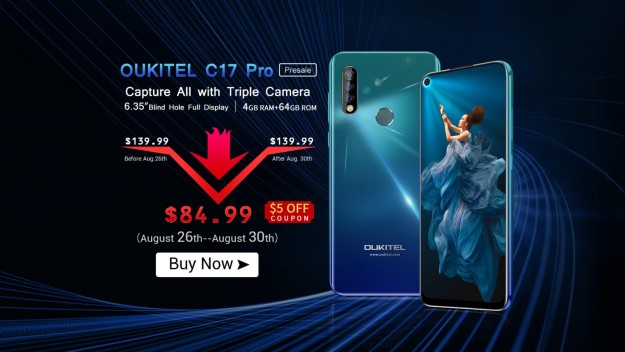 Цена смартфона Oukitel C17 Pro после выхода составит 140 долларов. Однако с 26 по 30 августа смартфон можно будет приобрести за 90 долларов. Кроме того, вы получите скидочный купон на 5 долларов от официального сайта Aliexpress.