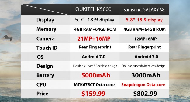 OUKITEL K5000 по характеристикам бросает вызов Samsung S8. Выиграл или проиграл?На прошлой неделе OUKITEL объявила о выпуске нового смартфона OUKITEL K5000. Этот новый смартфон оснащен 5,7-дюймовым 2,5D изогнутым дисплеем с соотношением сторон 18:9 и изогнутой крышкой батарейного отсека. По дизайну он очень похож на Samsung S8. Если вы считаете, что Samsung S8 слишком дорогой и хрупкий, вы можете посмотреть на OUKITEL K5000, поскольку у них есть много общего, а в некоторых аспектах K5000 даже выигрывает. Во-первых, дисплей. OUKITEL K5000 имеет 5,7-дюймовый HD + дисплей с соотношением 18:9. В то время как Samsung Galaxy оснащен 5,8-дюймовым дисплеем с Quad HD + разрешением и соотношением 18:9.