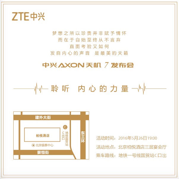 Озвучена официальная дата анонса флагмана ZTE Axon 7Компания ZTE разослала СМИ пригласительные на презентацию нового флагманского смартфона Axon 7, которая состоится 26 мая. Пригласительное сопровождает слоган "Listening to the heart of power" - завуалированный намек на то, что будущей новинки может достаться мощная аудиосоставляющая.