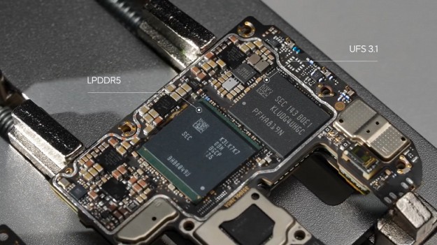 В процессе разборки можно убедиться, что компании пришлось потрудиться, чтобы оправдать звание компактного флагмана для Xiaomi 12. Уже привычная двойная материнская плата дополнительно «уплотнена», и компоненты располагаются очень тесно. На плату интегрирован в том числе основной датчик тройной камеры, а большая часть места отведена под различные чипы, такие как флеш-память UFS3.1 и SoC.