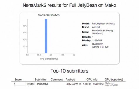 Первые тесты LG Google Nexus (Mako) подтвердили ранее заявленные характеристикиОпубликованные на днях тесты NenaMark2 и AnTuTu смартфона LG Google Nexus (Mako), доказали справедливость ранее заявленных характеристик.