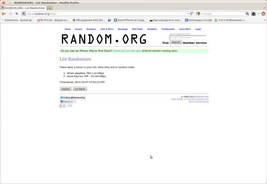 Планшет Prestigio MultiPad 7.0 Ultra Duo нашел своего владельца!Мы рады сообщить Вам, что победительницей конкурса от портала Smartphone.ua, главный приз которого планшет Prestigio MultiPad 7.0 Ultra Duo, стала Юлия Щербюк. В конкурсе приняло участие без малого 863 человек. Наш пост увидело 4392 человека. К сожалению, правильных ответов (769 грамм) было всего два — от Юлии Щербюк и Анны Кручко. Победителя выбирал сервис http://www.random.org/lists/. Его случайный выбор пал на Юлию Щербюк. Поздравляем! Благодарим всех Вас за участие! Отметим еще нескольких наших читателей наиболее приблизившихся к правильному ответу: - Евгений Жовнир 765 г - Ольга Петрашык 767 г - Наталья Вовченко 768 г - Дмитрий Гмыря 764 г - Зореслава Яремко 765 г - Okcana Sunshine Bodnar 774 г Джерело: SmartPhone.ua Обговорення новиниВалерий: Можно узнать точный вес чехла?Победителя поздравляю! Валерий: Поздравляю победителя!Можна узнать какой вес чашки и чехла,а то по моим подсчетам вес чашки 362 грамма судя по конкурсу,который Вы проводили раньше+вес планшета 305 грамм+вес чехла 68 грамм=735 грамм,я так и ответил.Это что же вес чехла 102 грамма? Валерий: Валерий.Думал практически так же изначально, только чашку принял за 361 грамм...Можно узнать вес чехла? Попередні новини