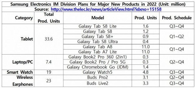 Согласно этому документу, в первом или втором квартале следующего года мы увидим флагманские планшеты Galaxy Tab S8/S8+/S8 Ultra. Их компания планирует произвести суммарно 2,5 млн единиц. Galaxy Tab S8 Lite выйдет лишь во втором полугодии, но таких планшетов компания выпустит уже 1,6 млн. Моделей Galaxy Tab A8 и Tab A7 Lite нового поколения произведут по 11 млн штук, а выйдут они когда-то в течение следующего года. Также в промежуток со второго по четвёртый кварталы нас ждут ноутбуки Galaxy Book2 Pro и Pro 360 и хромбук Galaxy Chromebook Go.