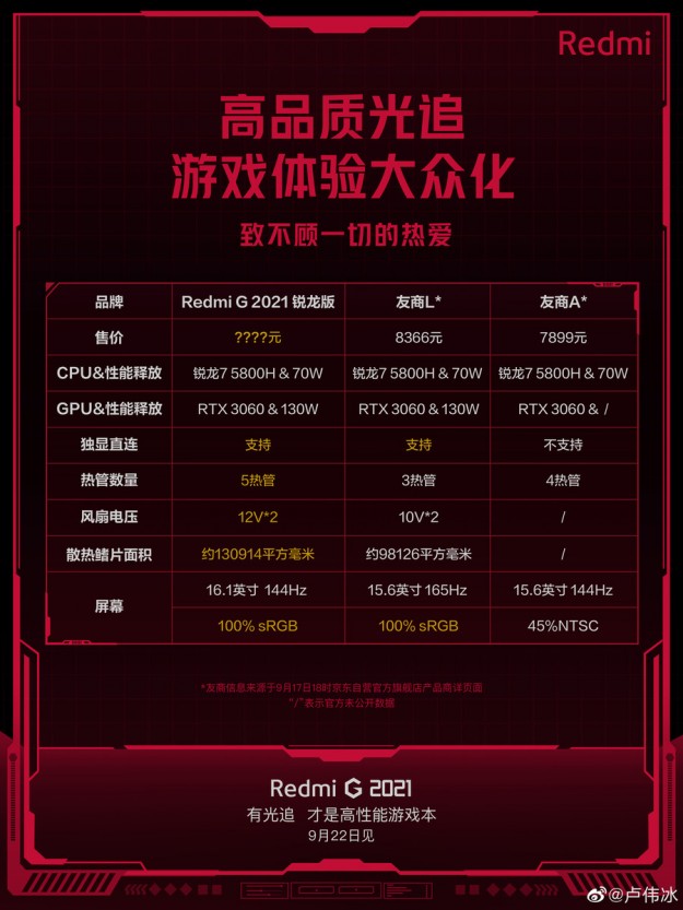 По соотношению характеристик и цены игровой ноутбук Redmi G 2021 может оказаться лучше Lenovo Legion 5 и Asus TUF A15Redmi интригует заманчивой ценой на Redmi G2021 Завтра Redmi официально представит игровой ноутбук нового поколения — Redmi G 2021. Характеристики уже во многом известны благодаря официальным тизерам, а сейчас в Сети появился интересный слайд-сравнение Redmi G 2021 с конкурентами — Lenovo Legion 5 и Asus TUF A15.