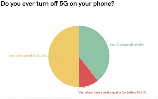 В исследовании, проведённом популярным порталом Android Authority, участвовало более 1300 респондентов. Дополнительно участникам опроса предлагалось поделиться комментариями. Как оказалось, 5G всегда активен только у 50,11 % опрошенных. Организаторы не исключили, что некоторые пока просто не знают, как отключить эту весьма энергозатратную функцию.