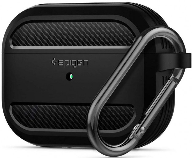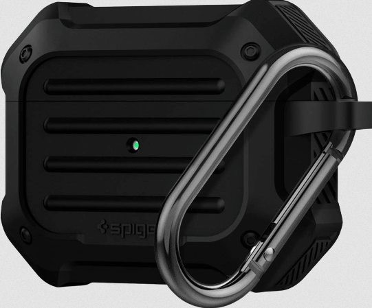 Жесткий бронированный чехол Spigen Tough ArmorЕсли вам нужен еще более прочный чехол, обратите внимание на Tough Armor. Это настоящая «броня» для ваших AirPods Pro, способная защитить их практически от всего. Даже если что-то тяжелое упадет на футляр или вы уроните AirPods с 10 этажа, будьте уверены – они останутся абсолютно невредимы. В комплект также входит карабин.