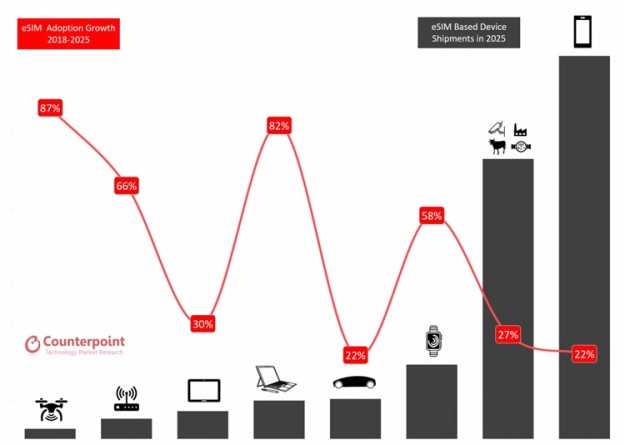 Поставки устройств с поддержкой eSIM к 2025 году вырастут в пять разКомпания Counterpoint Technology Market Research обнародовала прогноз по мировому рынку устройств с поддержкой технологии eSIM, или embedded SIM.