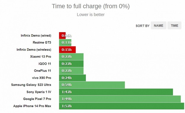 Тесты показали, что смартфон зарядился с 1% до 100% за 6 минут 27 секунд, хотя он продолжал потреблять энергию еще некоторое время, и система сообщила о полном заряде через 7 минут 51 секунду. Сама Infinix, напомним, говорила о 8 минутах. То есть, в отличие от некоторых других производителей, в данном случае результат подтвердился с небольшим запасом, а если считать минимальное время, указанное первым, то с огромным запасом. До 25% смартфон заряжается всего за одну минуту, как и обещает производитель. На достижение отметки в 50% нужно чуть более двух минут.