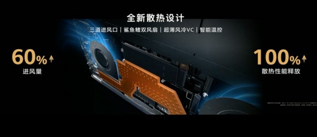 Новинка получилась довольно тонкой (15,5 мм) и легкой – масса составляет 1,38 кг. Ширина верхней рамки экрана составляет всего лишь 6 мм, при этом инженеры интегрировали в нее веб-камеру. В числе новшеств также новая система охлаждения с двумя вентиляторами и большой медной пластиной, в составе которой проходят тепловые трубки. Huawei уверяет, что рассеивание тепла увеличилось на 100%.