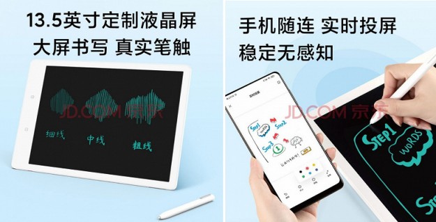 В комплекте с планшетом идет пассивная беспроводная электромагнитная ручка, которая не требует подзарядки и может быть использована в любое время. Ход пера составляет всего 0,7 мм, что сравнимо по ощущениям с использованием традиционной ручки. Планшет Mijia LCD Small Blackboard Storage Edition имеет флеш-память объёмом 121 МБ и может хранить до 400 страниц. Вы можете сохранять записи локально. Устройство также может быть сопряжено со смартфоном, что даст пользователям возможность добавить поддержку резервного копирования на облачный диск Xiaomi.