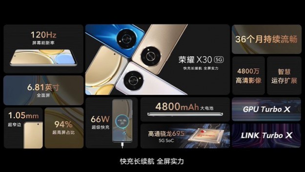 Смартфон получился большим, но практически вся фронтальная панель отдана экрану диагональю 6,81 дюйма с кадровой частотой 120 Гц. За счёт сверхтонких рамок 1,05 мм он занимает 94% площади передней панели. Фронтальная камера, как видно на изображении, врезана по центру. Толщина Honor X30 составила 8,05 мм, масса — 189 граммов.