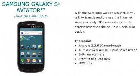 Samsung Galaxy S Aviator - работает на базе Android 2.3 Gingerbread, снабжен 4,3-дюймовым сенсорным Super AMOLED Plus с разрешением WVGA 480*800 пикселей. На борту телефона имеется: 2 камеры (фронтальная 1,3 Мп для видеотелефонии, и основная 8-мегапиксельная), модуль GPS, Wi-Fi 802.11b/g/n, Bluetooth 3.0, MicroUSB-порт, разъем HDMI и стандартный аудиоразъем. Размеры коммуникатора составляют 130*68*11,7 мм, вес — около 140 г.