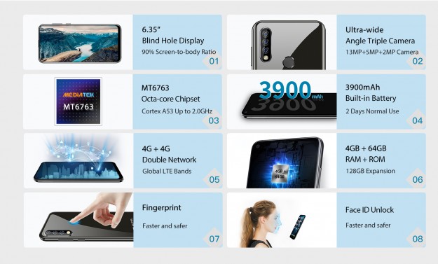 Oukitel C17 Pro будет оснащен 6,35-дюймовым дисплеем разрешением 720 х 1560 пикселей с соотношением сторон 19,5:9 и отверстием под фронтальную камеру. Над камерой находится разговорный динамик и светодиод, который в зависимости от ситуации подсвечивает красным или зеленым цветом. Экран со сверхвысоким соотношением сторон экрана к корпусу, его площадь занимает 90% лицевой панели. Диагональ 6,35-дюйма, разрешение HD+. Дисплей покрыт стеклом Asahi, которое обеспечивает естественную защиту. Основная камера состоит из основного датчика изображения Sony разрешением 13 Мп, а также дополнительных датчиков разрешением 5 и 2 Мп. C17 Pro будет поставляться с трехобъективной камерой со светодиодной вспышкой. Важно уточнить, что фронтальная камера скрыта в верхнем левом углу спереди. Фронтальная камера оснащена 5-мегапиксельным сенсором.