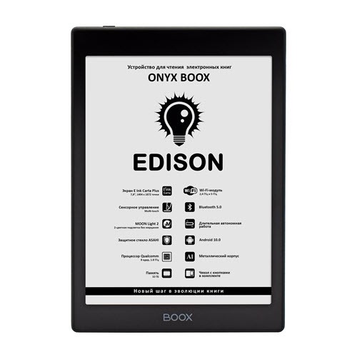 Литиево-полимерный аккумулятор обеспечивает высокую степень автономности, позволяя сократить количество необходимых зарядок устройства. Разъём USB Type-C поддерживает функцию OTG, благодаря которой к устройству можно подключать различные дополнительные устройства, такие как накопители, наушники, клавиатуры и т.п. ПО ридера поддерживает работу с большинством популярных текстовых форматов, а также позволяет воспроизводить аудиофайлы MP3 и WAV. Благодаря встроенным словарям имеется возможность переводить текст непосредственно во время чтения, также на ридер можно установить дополнительные словарные базы. ONYX BOOX Edison имеет встроенный магазин приложений, в котором можно найти множество полезных и нужных программ. Библиотека ридера позволяет пользователю сортировать книги по авторам, названиям и сериям, а удобный поиск и фильтры помогут быстро найти нужное произведение. Приложение WEB-чтение дает возможность передавать из браузера и читать на ридере понравившиеся интернет-страницы, настраивая при этом различные параметры отображения текста. Благодаря функции TTS можно прослушивать содержимое текстовых файлов. Помимо стандартного способа записи книг через USB-кабель доступен облачный сервис Send2Boox. Поддерживается возможность одновременной работы сразу с двумя приложениями на одном экране - функция Split View. ONYX BOOX Edison в корпусе черного цвета поступил в продажу и доступен по рекомендованной розничной цене $349 / 26 990 рублей. Приобрести новинку можно в фирменных салонах электронных книг ONYX BOOX или в интернет-магазинах ONYX BOOX и Palmstore, а также в сети цифровых супермаркетов ДНС. Технические характеристики модели ONYX BOOX Edison: